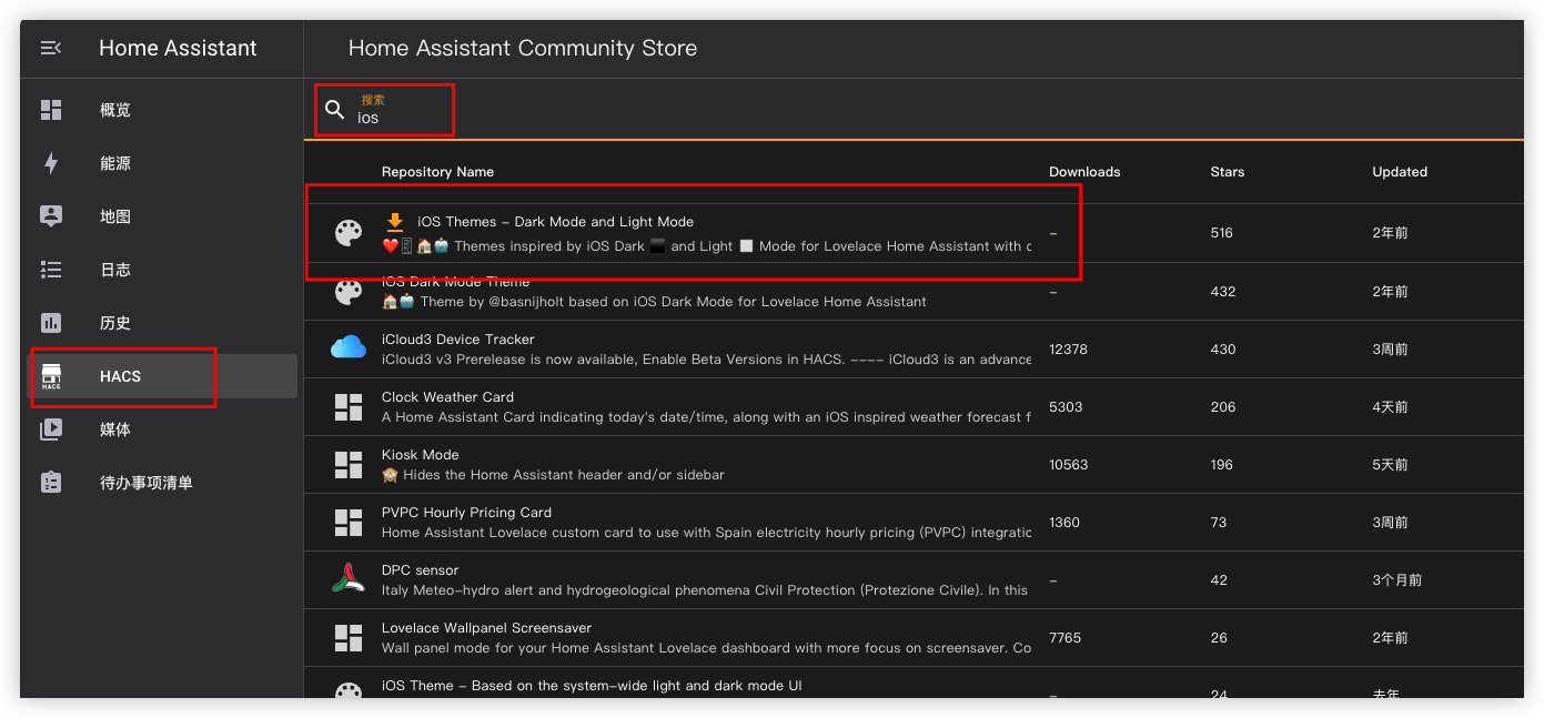 至此,左侧菜单已经出现 HACS ,可以点击安装相应的 插件、主题等等了。